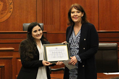 As part of the program, NAWJ Judges Sage and Naranjo presented University of Texas second year law student Harjeen Zibari, a $1,000 “Access to Justice Scholarship” given by NAWJ for her demonstrated and passionate commitment to the enforcing civil and human rights. Ms. Zibari has worked extensively within her Kurdish community where most female Kurdish immigrants have limited education, including her work at the Capital Area Private Defenders and the Human Rights Initiative of North Texas. She shared how she became interested in the law and her own experience back in her home country of Kurdistan (fka Northern Iraq) including the invasion nearby by ISIS.
